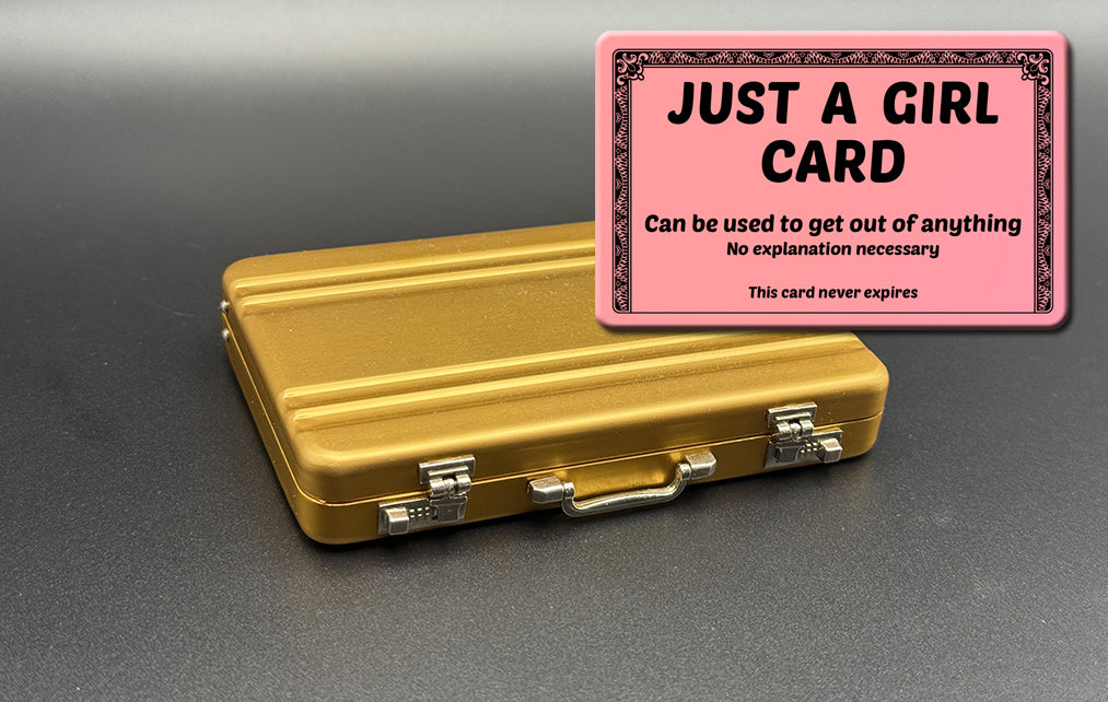 An aluminum mini briefcase for your new cards! It holds up to 14 plastic cards. Perfect for some money, your ID, a credit card, and a couple excuse cards.